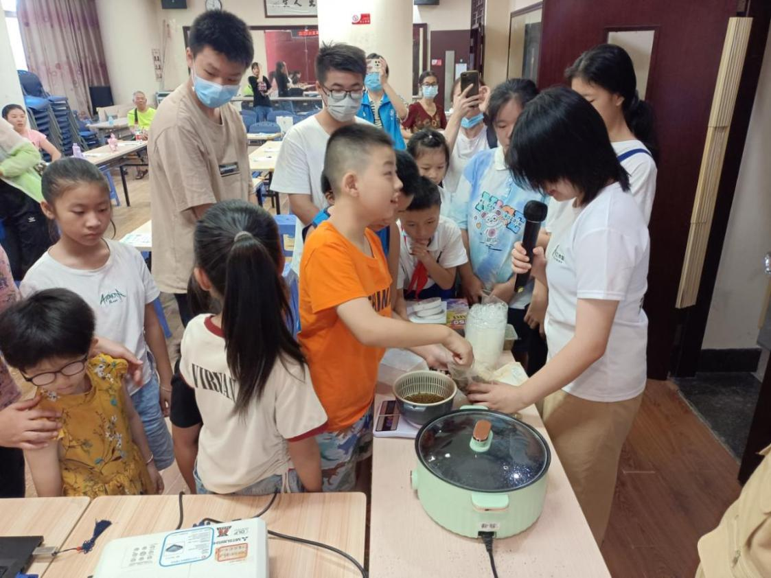 活动中,先由华南农业大学农潮工作室老师介绍广式糖水的历史,了解广式糖水的种类和功效等知识,随后,老师带领亲子家庭共同制作经典广式糖水绿豆沙,带领青少年使用剩余的绿豆制作图画,青少年们逐个上台分享自己的画作,品尝绿豆沙糖水。