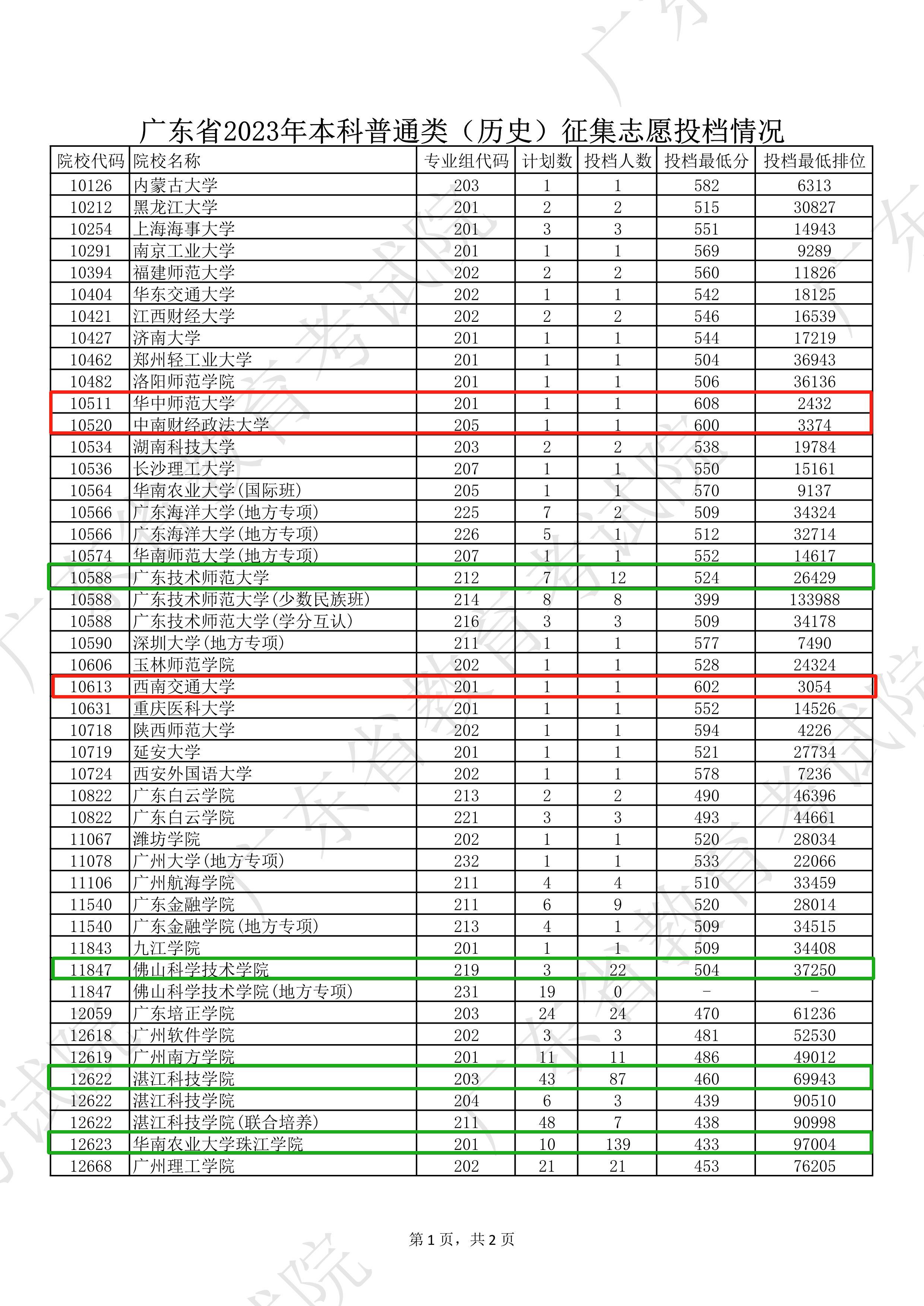 普通类(历史)方面,华中师范大学、中南财经政法大学、西南交通大学等院校有专业组也在600分以上完成投档。记者注意到,广东技术师范大学、广东海洋大学、佛山科学技术学院、广州华立学院、广东白云学院、湛江科技学院、华南农业大学珠江学院、广州商学院等院校有专业组投档人数大于计划数。