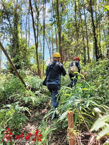 广州供电局线路运维工作人员烈日下通过山林开展巡线