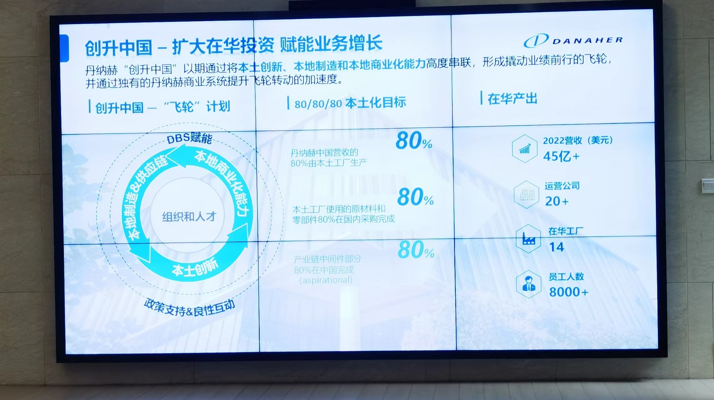丹纳赫集团中国区政府事务部副总裁韦春艳介绍,2022年,丹纳赫的本土化战略再度深化,全面启动了“创新中国”战略,并在“创升中国”战略的“8080”量化目标中,明确提出80%未来在中国的产品销售都要在中国生产;本土工厂使用的原材料和零部件有80%在国内采购完成,以带动本土大健康产业链上下游协同发展。