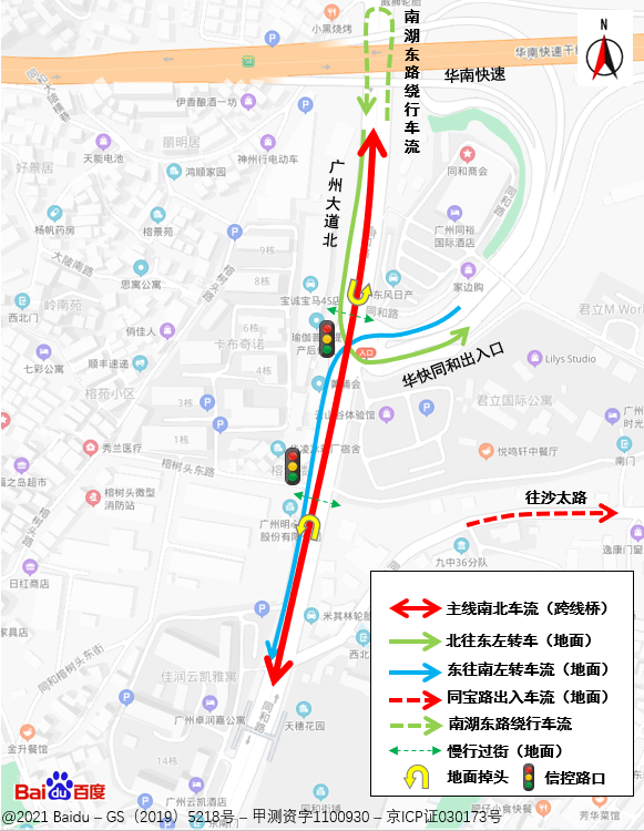 三、南往东进入同和收费站车流:广州大道北(南往北)→地面辅道→同和收费站;当南往北地面辅道拥堵时,建议选择通过新建跨线桥往北行600米→南湖东路交叉口掉头→进入北往南地面辅道→左转进入同和收费站。