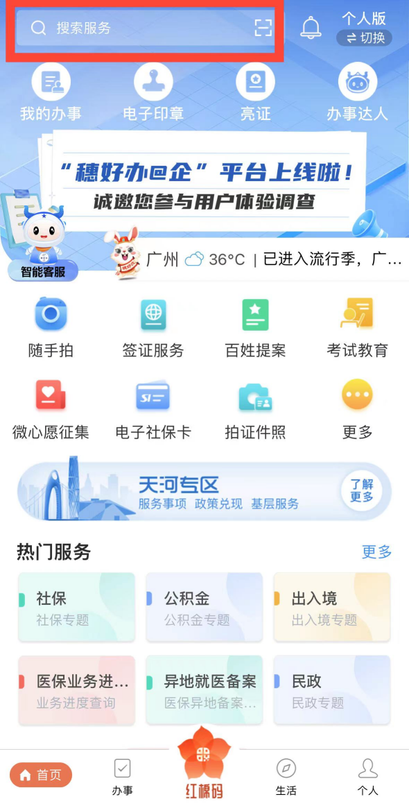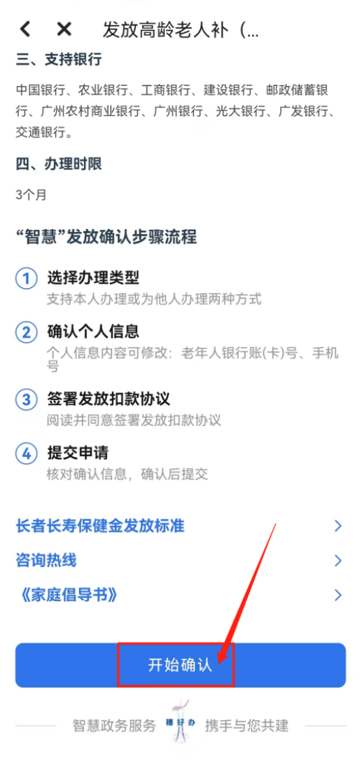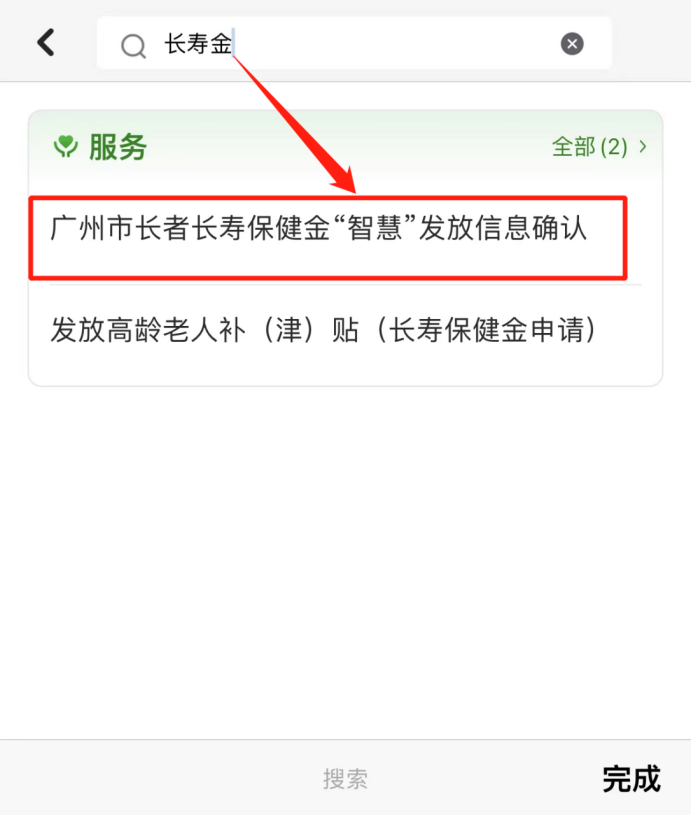 信息确认指引:点击主页顶部搜索框——输入【长寿金】——点击【广州市长者长寿保健金“智慧”发放确认】,按系统指引办理。