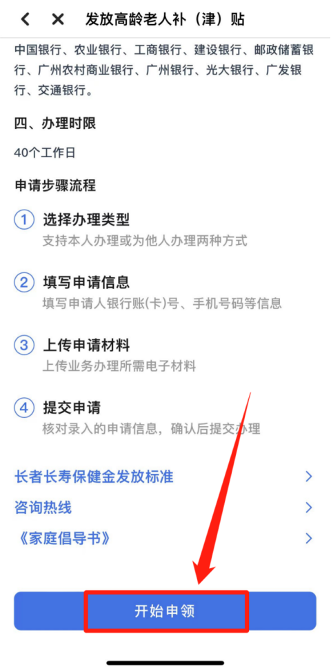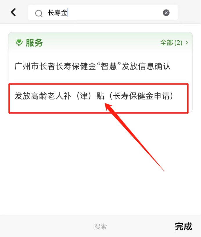 补充申领办理指引:点击主页顶部搜索框——输入【长寿金】——选择【发放高龄老人补(津) 贴 (长寿保健金申请)】,按系统指引办理。