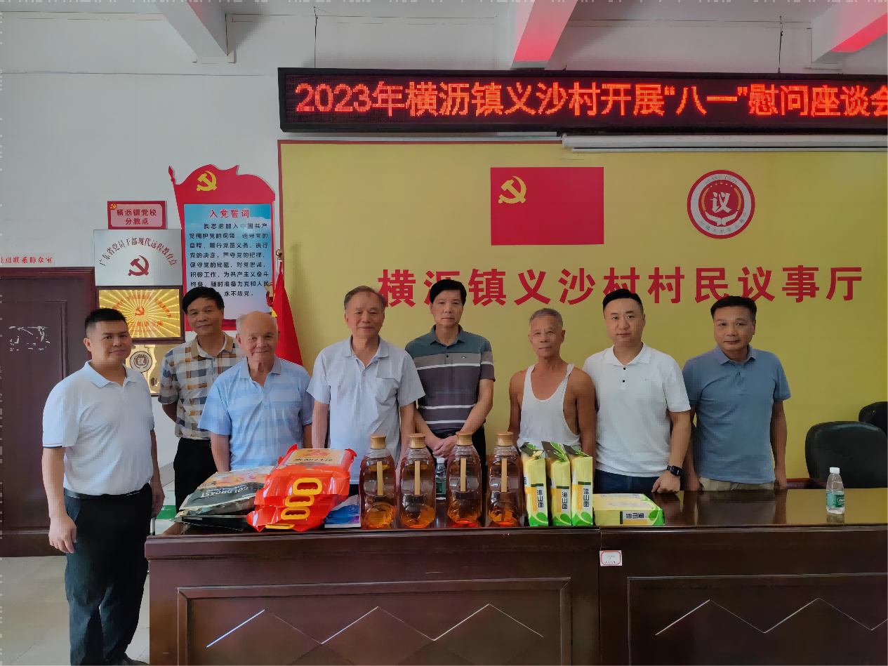 在义沙村,横沥镇党委委员、副镇长张琦向参加“八一”慰问座谈会的退役军人及现役军人家属表示节日的问候,感谢他们为国家、为人民作出的贡献,也为和谐村的创建奉献出自己的一份力量。义沙村党总支部书记何福财勉励退役军人及现役军人家属继续关心和支持村工作,推动双拥工作再上新台阶。