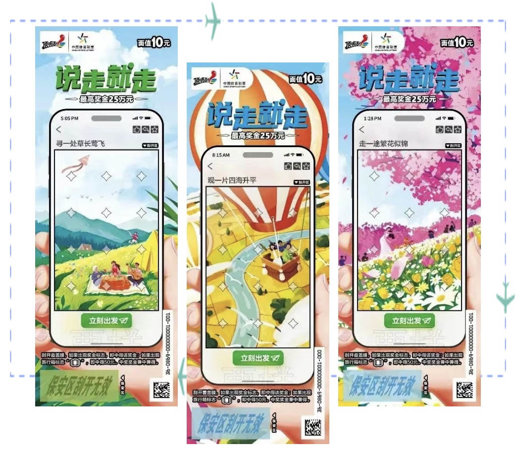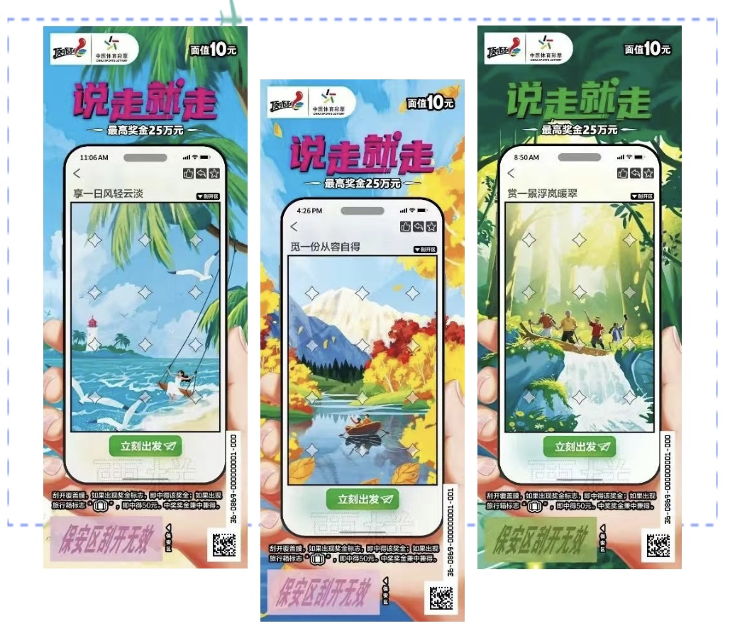 “顶呱刮”体彩即开票“说走就走II”欢乐来袭、邀你即刻出发,指尖纵览江河湖海、山川岛屿,享一日风轻云淡、赏一景浮岚暖翠、走一途繁花似锦、觅一份从容自得、观一片四海升平、寻一处草长莺飞。此款即开票专为旅游爱好者打造,色彩绚丽,每一张都是绝美风景,画面以手机拍照的形式,记录旅途中的美景,跨越山海,说走就走,旅行就在眼前。