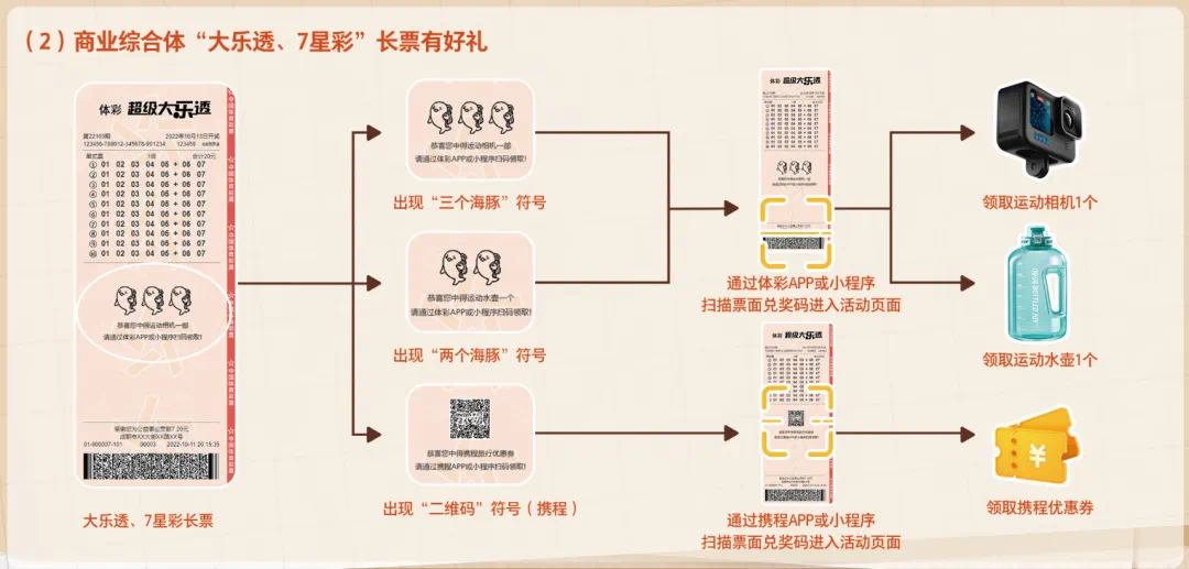 惊喜二:活动期间在指定体彩展示体验中心购买超级大乐透或7星彩彩票单票6注及以上单张彩票,出现3个“海豚”或2个“海豚”幸运符号即可通过体彩APP或微信小程序扫描票面兑奖码,登录活动页面领取运动相机或运动水壶,若票面出现二维码即可通过微信扫一扫扫描二维码进入携程活动页面领取“非常夏天”国内景点或携程超级假期旅行优惠券。