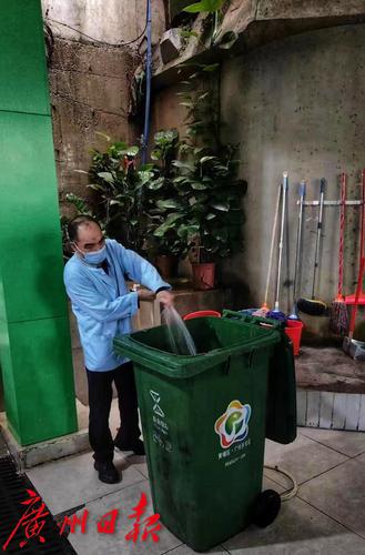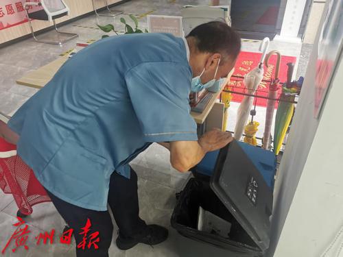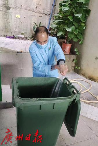 清洁工人谭和平2021年就来到黄埔区龙湖街幸福誉小区,他被安排为专职垃圾桶清理员,负责小区数十个垃圾分类桶的清洁工作,不知不觉,就干了两年多了,大家都亲切地称呼他“谭叔”。