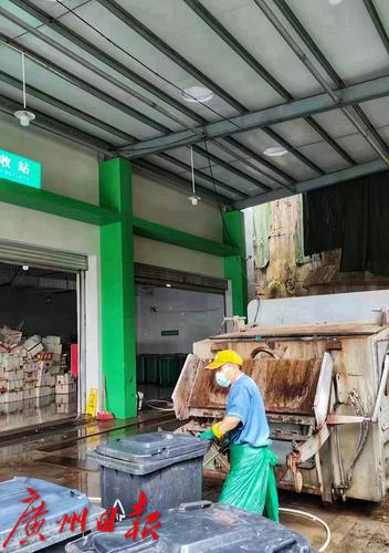 每天早晨七点,谭叔准时到岗。他穿上工作装与橡胶鞋,套好防水布,戴上帽子、口罩和两层手套,接好清洗的水管。不一会儿,负责收运垃圾的同事把在垃圾分类误时点待了一夜的垃圾桶送来,每天的清洗工作便正式开始。