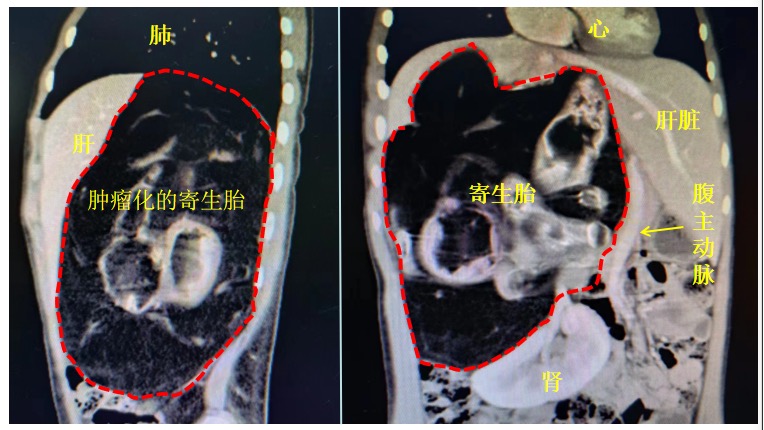 检查发现,由于该寄生胎早已死亡,呈肿瘤性生长。肿瘤将下腔静脉向前包绕、推挤达前腹壁附近,将腹主动脉向左侧严重向左侧推挤。肝脏、右侧肾脏、膈肌、右肺都受到了严重挤压,右肺功能也受到损害。