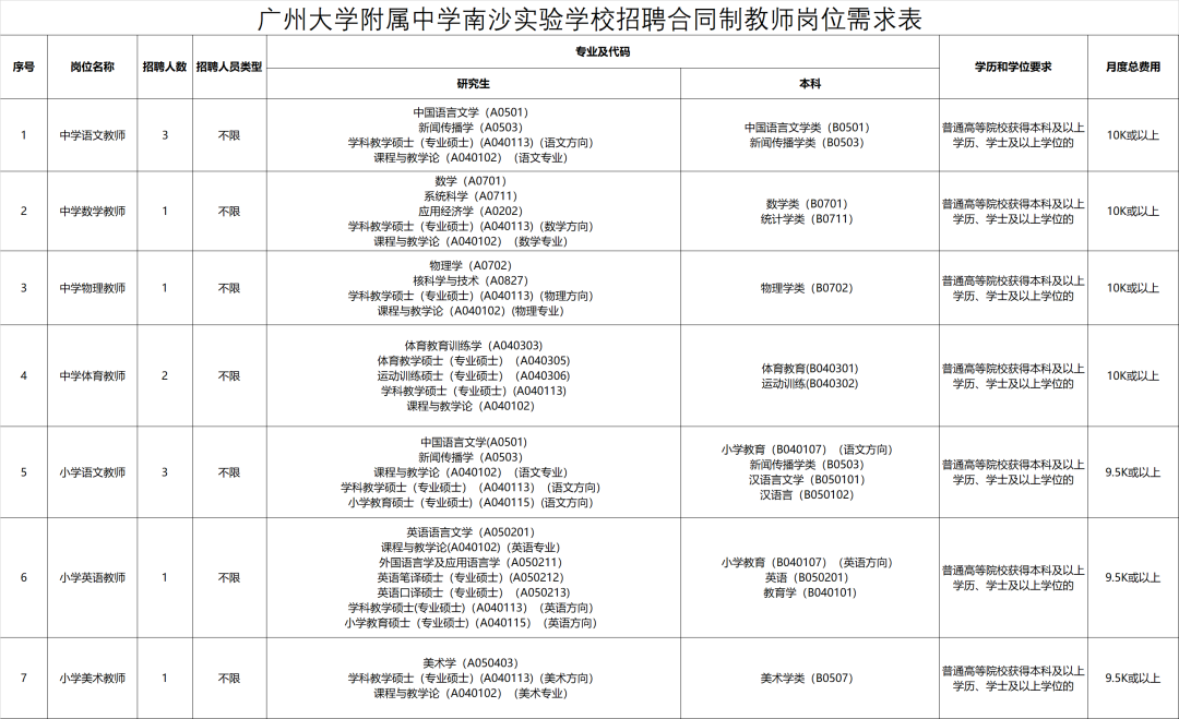 为加强广州大学附属中学南沙实验学校职工队伍建设,遵循“公开、平等、竞争、择优”的原则,结合广州大学附属中学南沙实验学校实际情况,决定公开招聘合同制中学语文教师3人,中学数学教师1人,中学物理教师1人,中学体育教师2人,小学语文教师3人,小学英语教师1人,小学美术教师1人,现将有关事项公告如下: