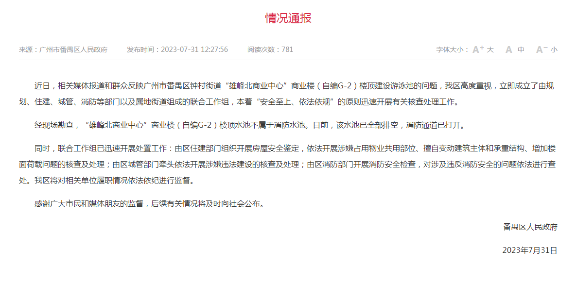 7月31日,番禺区人民政府通报楼顶建游泳池事件。全文如下: