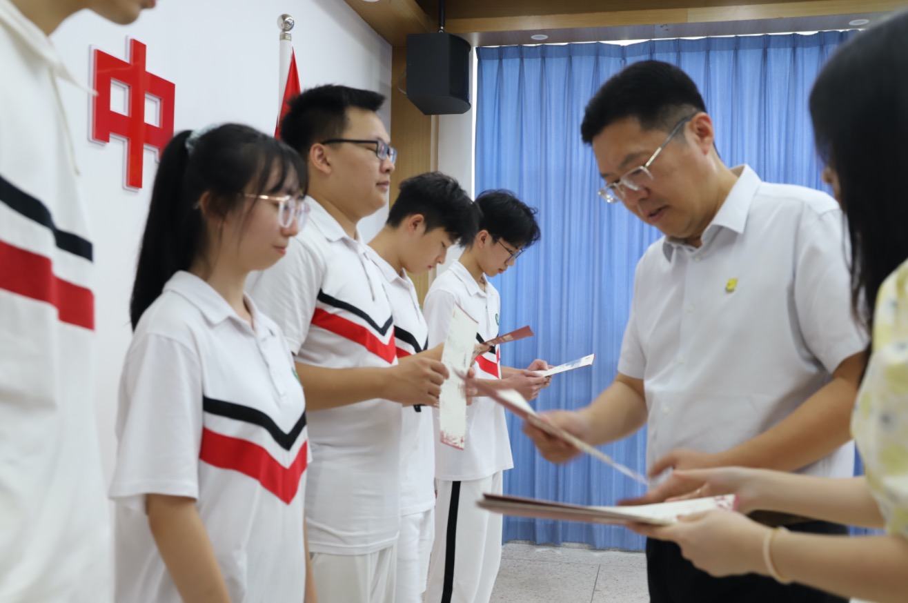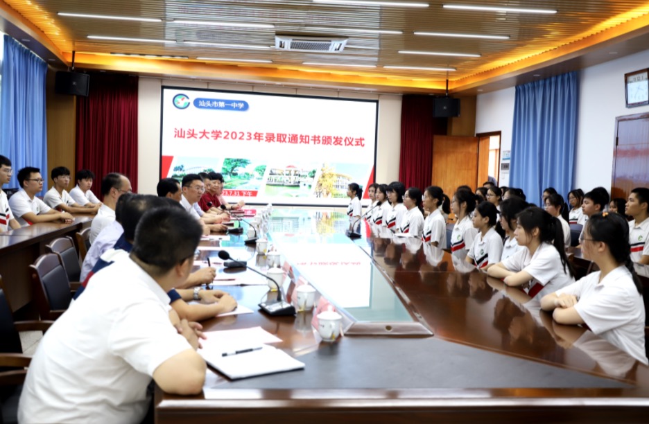 7月31日下午,“汕头大学2023年录取通知书颁发仪式”在汕头市第一中学举行,汕头大学党委副书记、校长郝志峰在现场为被录取的汕头市第一中学高三毕业生代表颁发录取通知书。