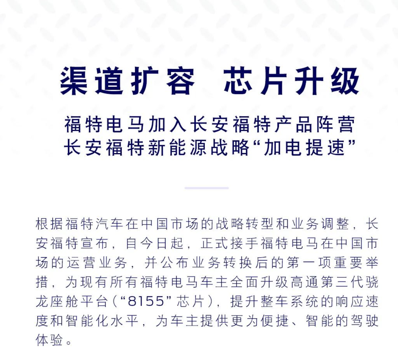 8月1日,长安福特发布公告称,将正式接手福特电马的中国业务,并公布了业务转换后的第一项重要举措。即,为现有所有福特电马车主全面升级高通第三代骁龙座舱平台(“8155”芯片),提升整车系统的响应速度和智能化水平。