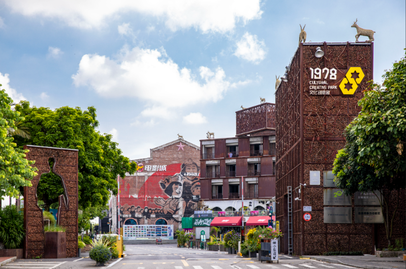“可贵的是,糖纸厂的改造本身也是延续了改革开放的精神。”陈泽江说。2014年7月,在增城区委区政府的支持下,遵循广州市国资委指示和“三旧”改造政策,引入社会资本,1978 文化创意园开始立项改造建设。2015年,广东省财政厅、省新闻出版广电局等八部门出台了《关于支持广东省电影发展若干经济政策的通知》,1978文化创意园迅速调整发展战略,将发展主题确定为集文化创意、休闲旅游为一体的电影特色小镇。糖纸厂旧工业建筑的改造自此迅速开展,活化老厂房,对厂区及周边旧厂房、旧仓库和周边散落民居旧村庄进行创意性开发改造,不大拆大建,只进行外立面改造。引入了90多家优质企业和商家入驻,一年后糖纸厂成为“增城文化创意产业标志”。
