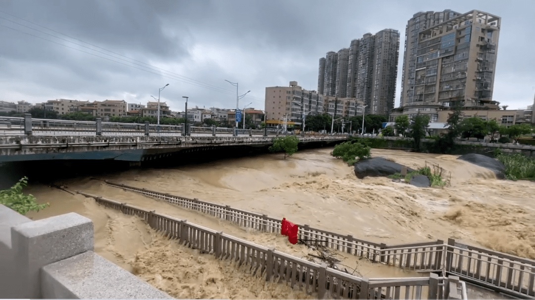 在2015年第13号台风“苏迪罗”影响期间,福建省厦门市同安区东溪河水位暴涨,桥下水流湍急 图/同安区人民政府防汛抗旱指挥部