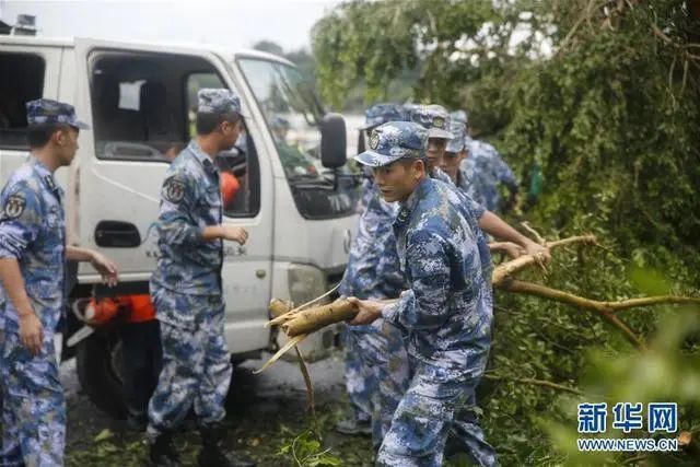 2016年9月15日,在福建厦门街头,部队官兵在清理被大风吹断的树木。图/新华社
