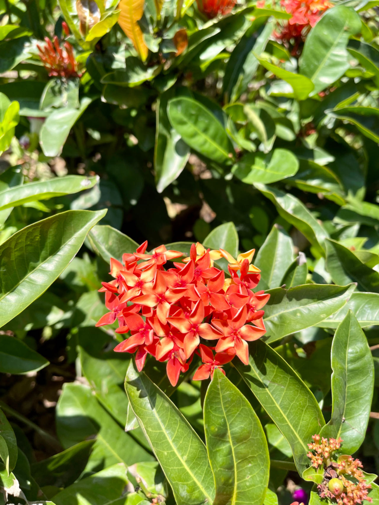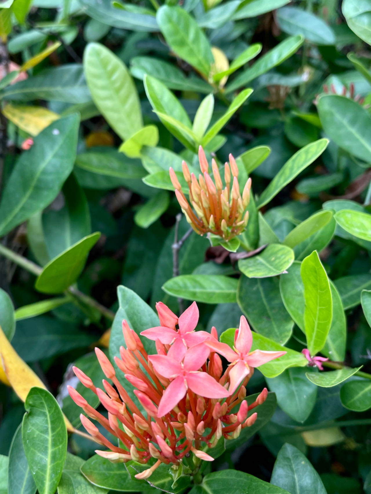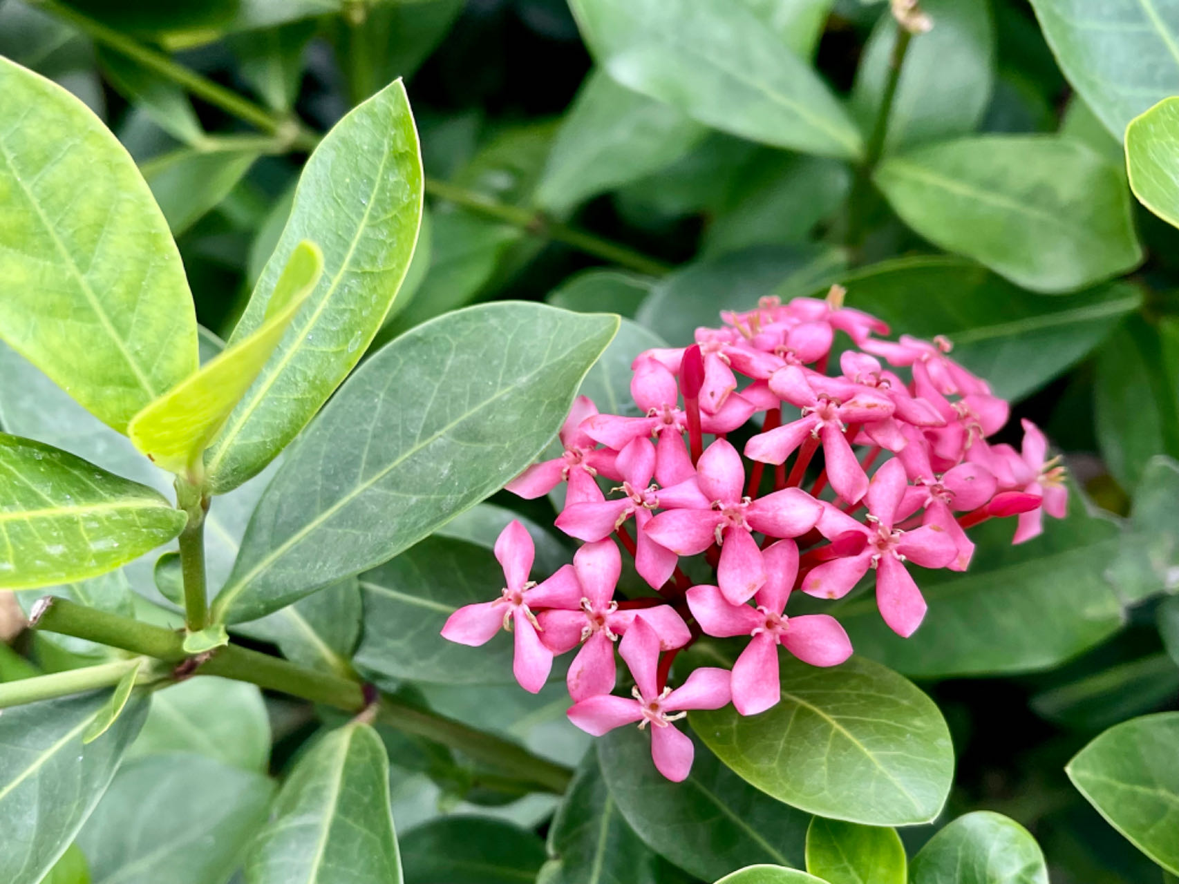值得一提的是,龙船花并非只有花色不同,不同品种的植株“身高”“颜值”都不一样。比如,最经典的中国龙船花,花色为橙红色,叶子尖端呈略微圆润;爪哇龙船花则多为粉红色,叶子也更显圆润些;矮龙船花为植株矮小的园艺品种,叶子细小适合制作盆景;大王仙丹花则气场十足,叶面的叶肉略微隆起,无论叶子和花朵都比普通品种大。