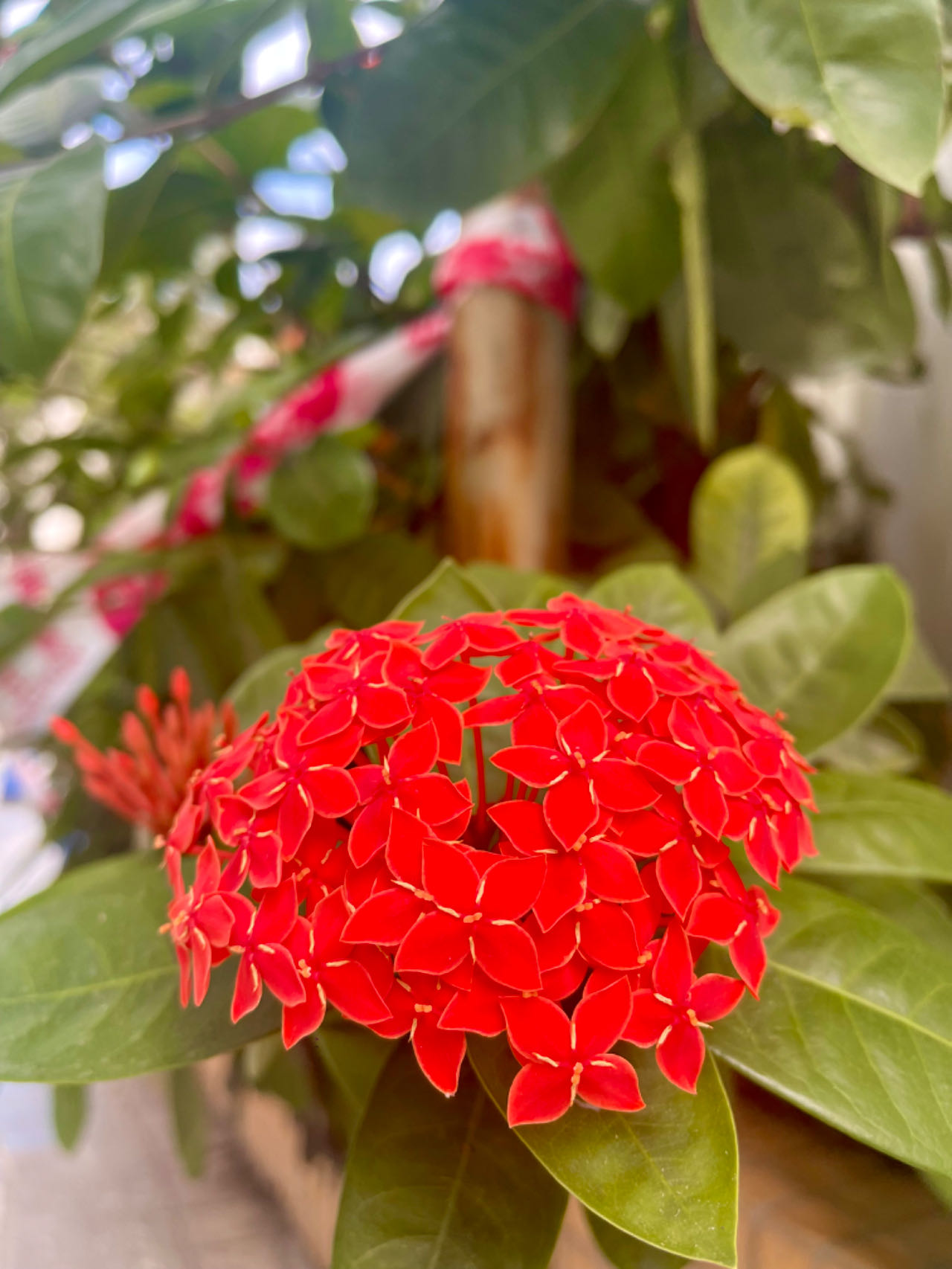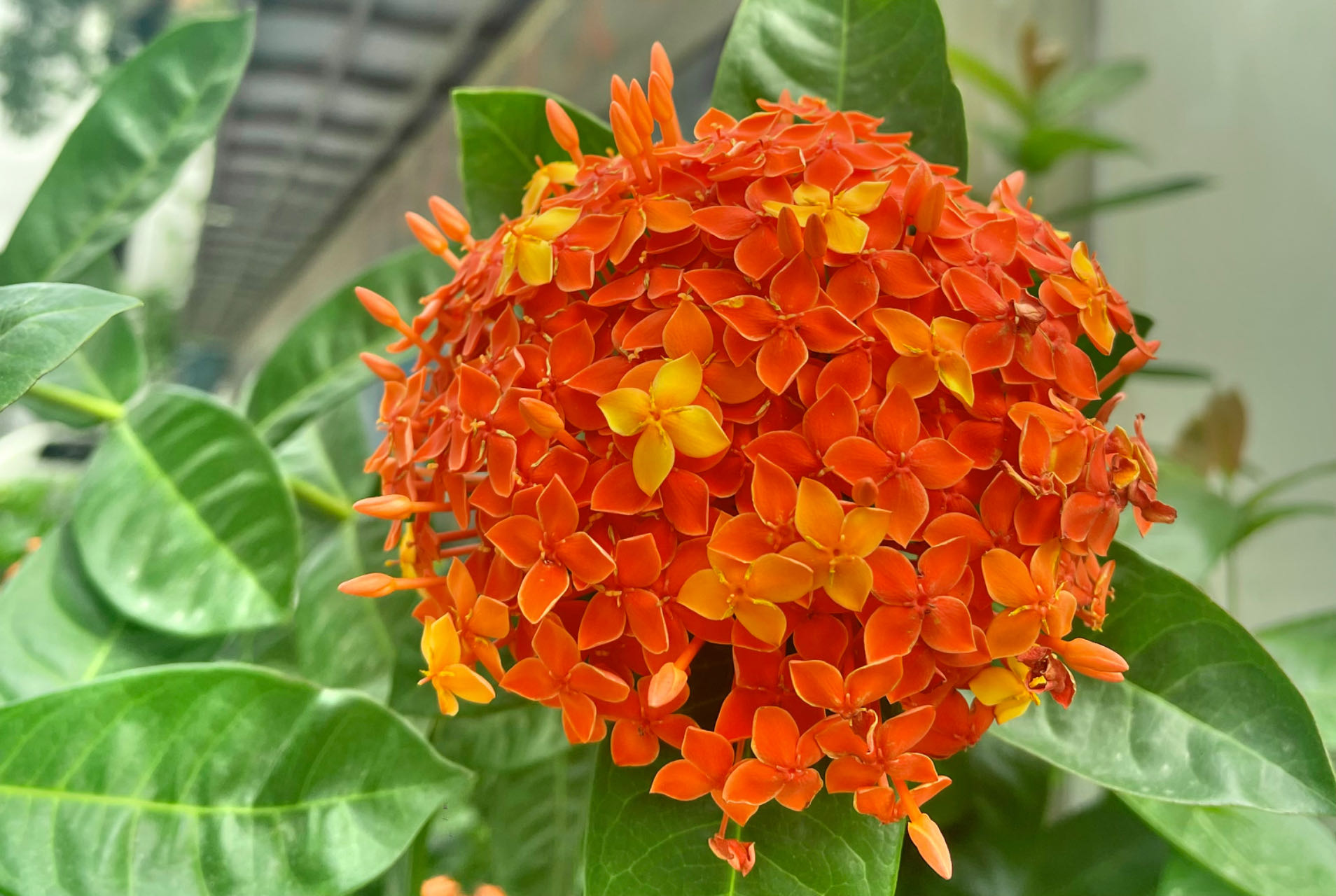 红似火、橙如霞,聚伞花序顶生的花朵浮于叶面上,一簇簇的扎堆盛开的样子,远看有点像绣球,因此龙船花也有“水绣球”“红绣球”等美称。虽然模样似绣球,花期却比绣球长得多,生命力也更为旺盛。在各种时花中,龙船花是一种易养能耐的强者,而且不必常修剪,属于低维护性优良灌木。