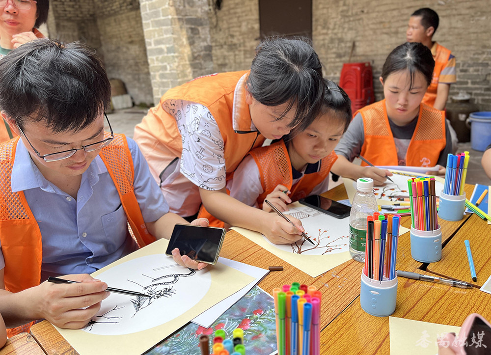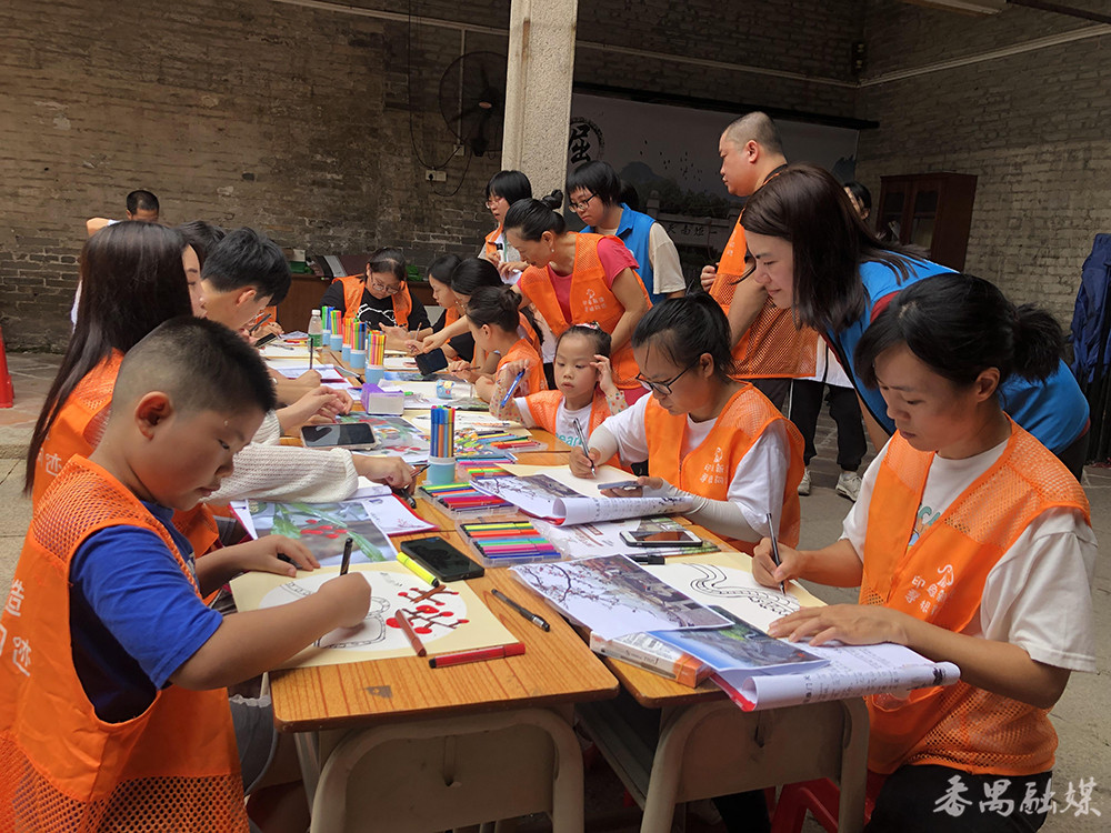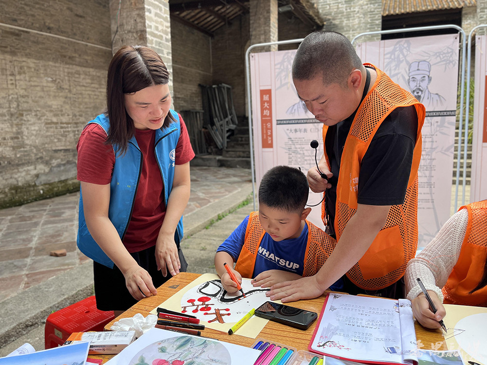 在听泉屈公祠,亲子家庭在书画老师的指导下,纷纷将参观过程中的所见所闻,融入到各自的作品当中,当中既有与屈大均诗词《红豆曲》《广州荔枝词》《木棉花歌》相关的“红豆”“荔枝”“木棉花”等元素,也有以屈大均故里景点为原型进行作品创作,一起讲好新造故事。