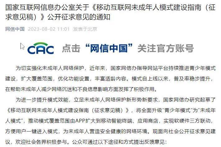 国家网信办拟将全面升级“青少年模式”为“未成年人模式”,推动模式覆盖范围由App扩大到移动智能终端、应用商店。