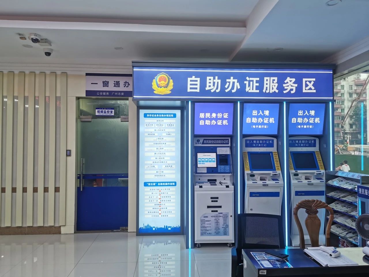 黄埔公安在辖内所有派出所内均布设涵盖户政、出入境高频事项自助服务设备,其中萝岗、新龙等9个派出所配备了“全警通”一体化自助机。黄埔公安不断拓展自助办证的范围,辖内共有25个社区警务室安装了户政或出入境警务自助办证设备,实现办证服务“自助办、随时办、就近办”,形成覆盖全区的警务自助服务网。 其中“全警通”一体化自助机融合了户政、出入境、交管高频事项自助服务,群众根据屏幕提示开展操作,自行选择领证方式,直接在一体机上办理,节约了群众等待的时间,提高了办证效率,实现了普惠范围更广,兼具多警种、高频事项的自助服务。