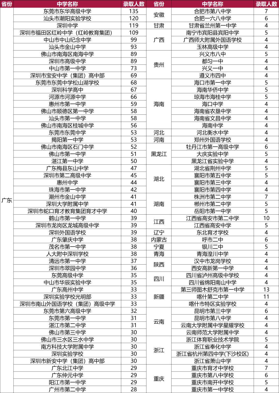 除以上四校外,排名前10的中学还有:中山市中山纪念中学、汕头市金山中学、佛山市南海区南海中学、深圳市高级中学、中山市第一中学、深圳市宝安中学(集团)高中部,录取人数均在65人以上。
