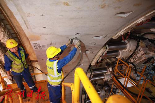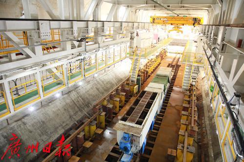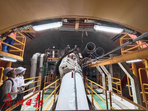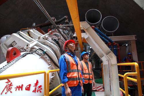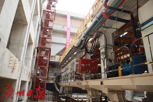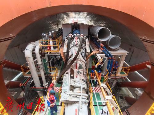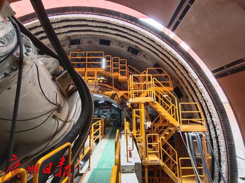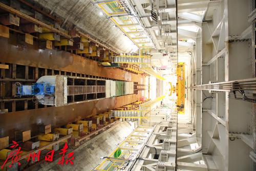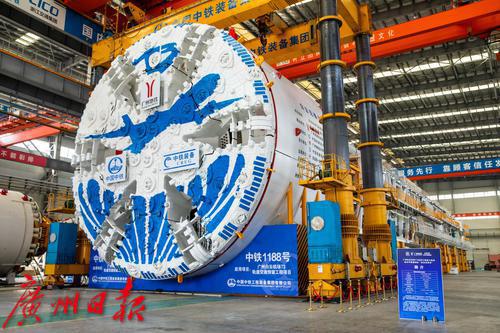 T3轨道交通枢纽广珠(澳)高铁隧道为单洞双线盾构隧道,区间线路长1.476公里。此次始发的“白云先锋号”大直径盾构机由刀盘、主机、设备桥和配套台车组成,整机全长145米,开挖直径为14.31米,总重量约4500吨,装机总功率约9000千瓦,总推力20000吨。