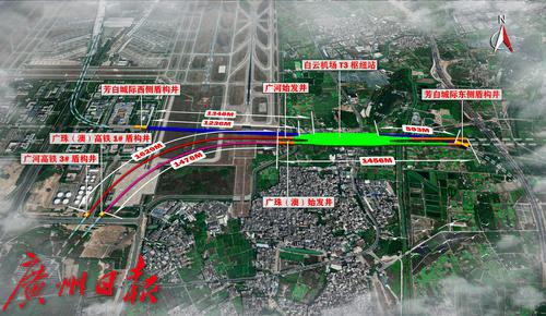 白云机场T3交通枢纽轨道交通预留工程示意图。