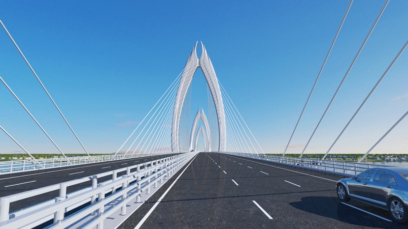 清远又称凤城,项目结合凤凰展翅入江救助百姓的典故,以“凤凰展翅”为主题,将凤凰羽翼的弧形层叠曲线应用于北江特大桥主塔造型。大桥主塔塔身形似“钻石”,塔冠为“凤凰尾翼”造型,斜拉索采用扇形布置,空间双索面,每一扇面由28对斜拉索组成。