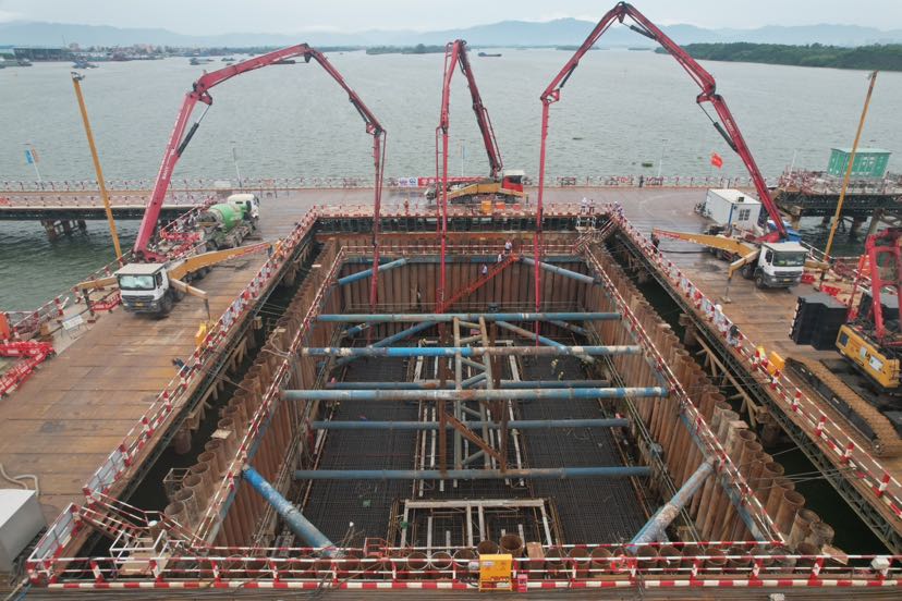 此次浇筑的5#水上主墩承台长34.8米、宽22.8米、高6.5米,钢筋数量多、预埋件多,存在温控要求严,施工浇筑周期长、难度大、安全施工风险高等难题。