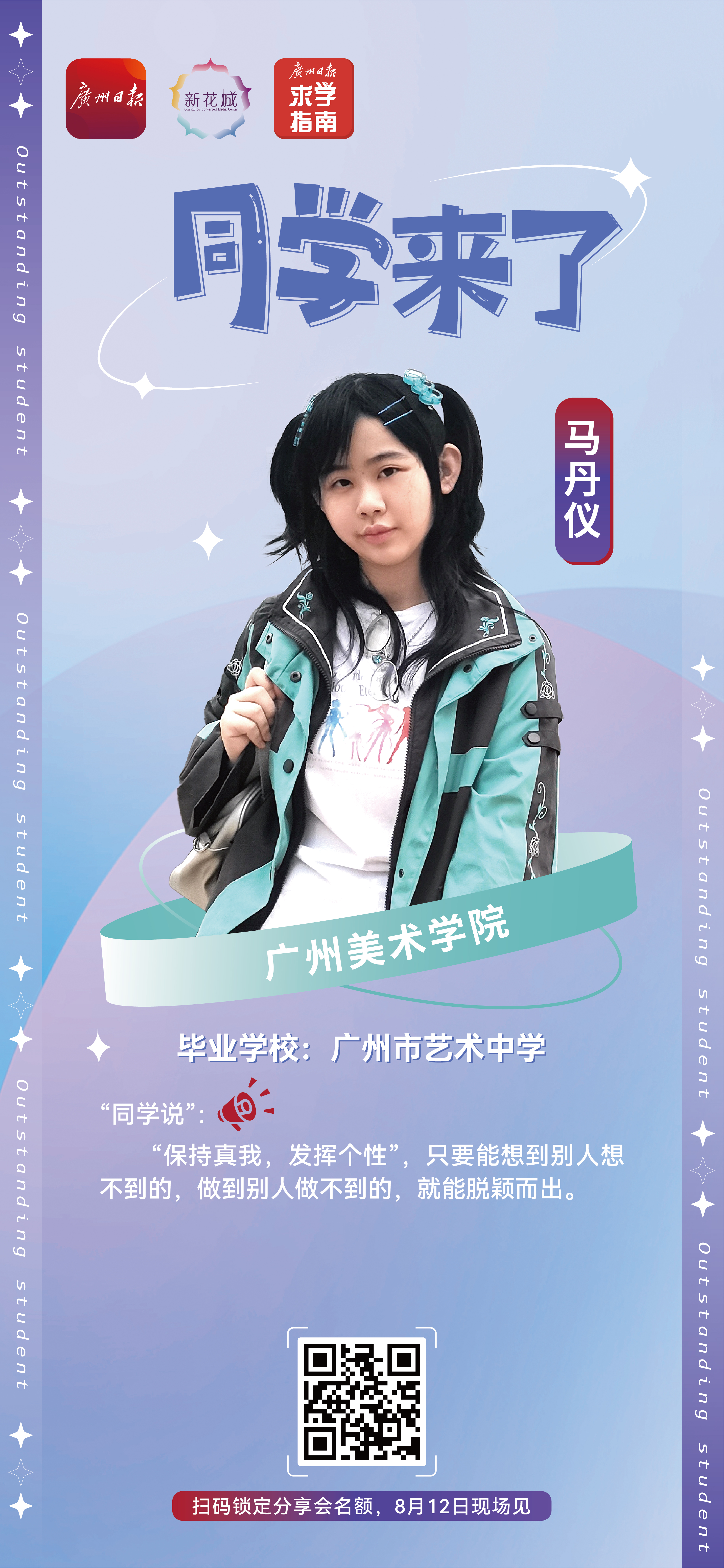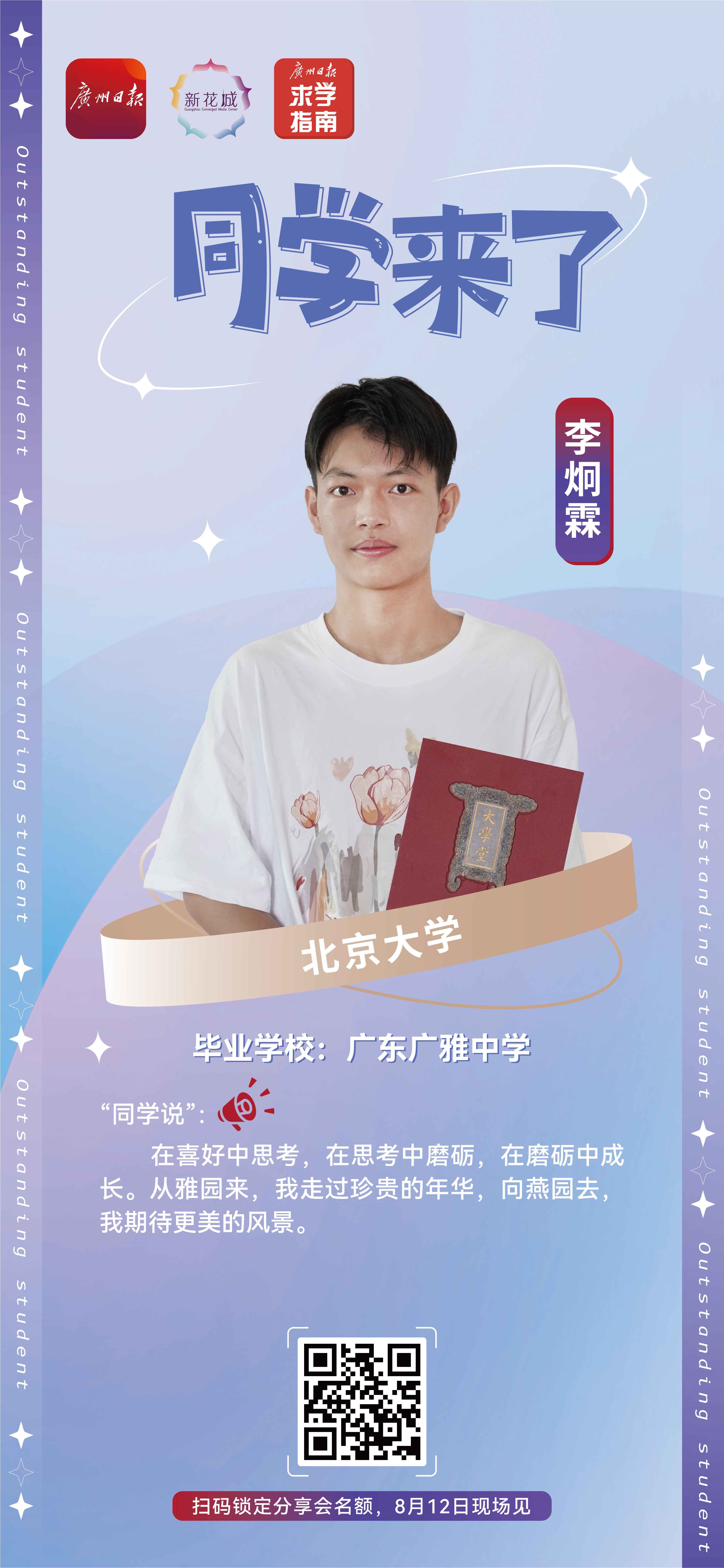 “同学来了”是由广报求学和广州日报·粤传媒联合打造的精品升学交流平台,每年暑假,我们邀请当年新晋大一学子,和广大学生、家长面对面畅聊升学路径,共话成长之道,激励中小学生在追求学习成绩的同时,不忘挖掘自身兴趣爱好,为未来发展做好规划和准备。