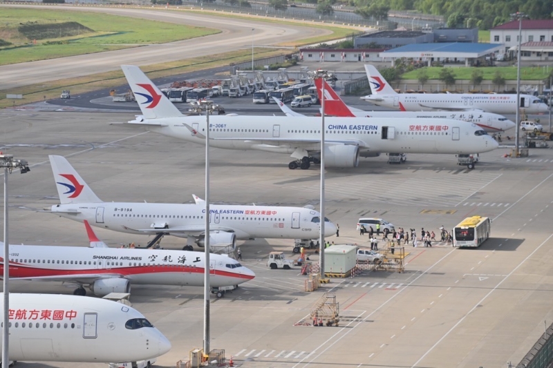 今日上午,东航接收的两架C919客机在虹桥机场停机坪上,准备执行沪蓉航线。
