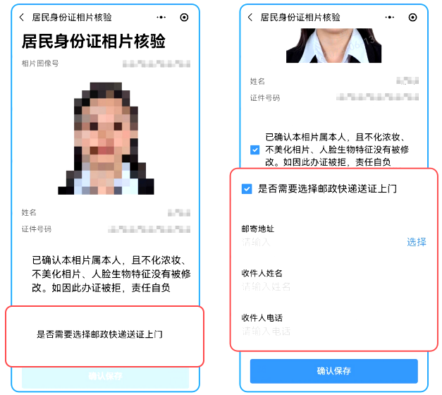 通过网上自助办理身份证业务的,可在“粤居码”微信小程序“一码通办”服务的相关界面勾选“是否需要邮政快递送证上门”,并填写邮寄信息。