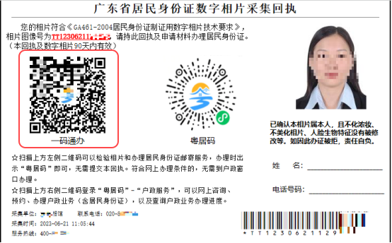 在人工窗口办理身份证业务的,可在办证前,通过扫描《广东省居民身份证数字相片采集回执》上的“一码通办”二维码办理。
