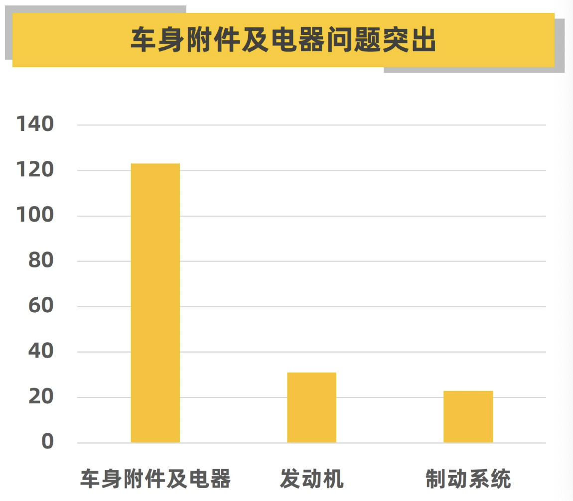 质量问题中,车身附件及电器相关问题突出,车机卡顿、失灵,车身附件异响、生锈等问题相对集中。