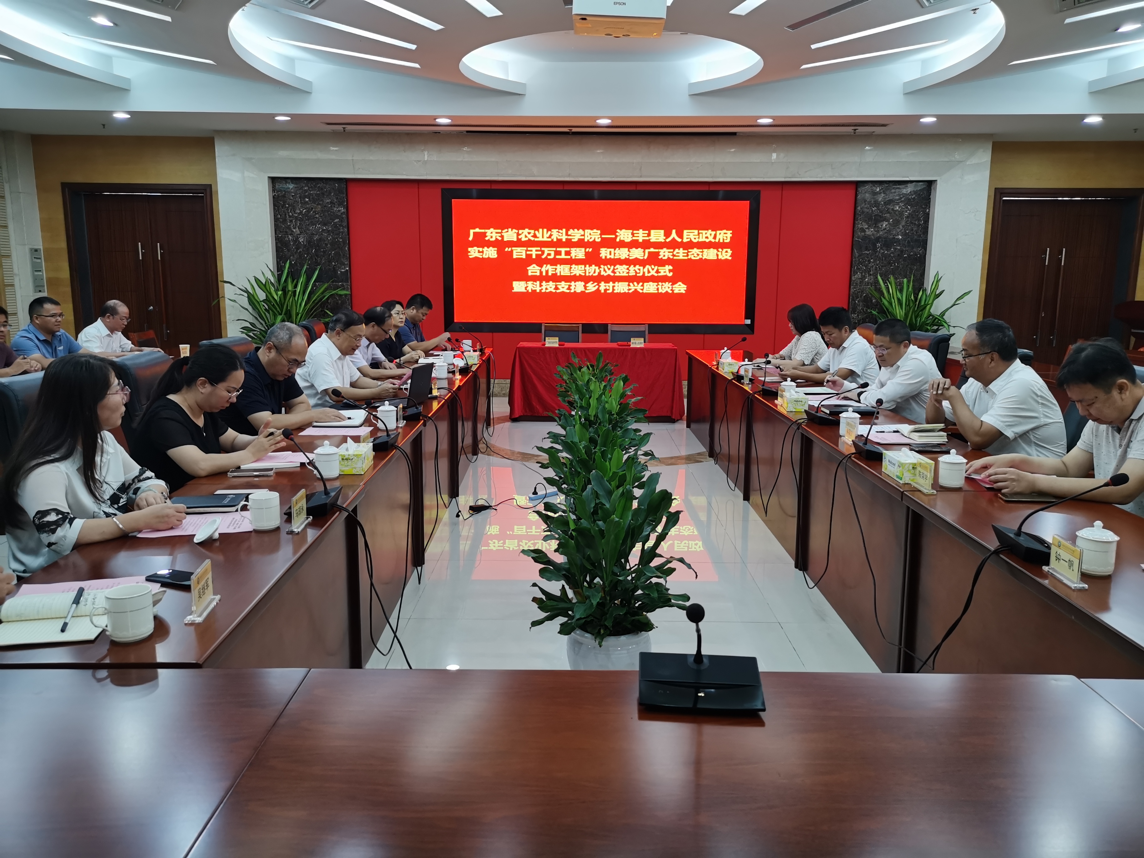 8月4日,广东省农科院与海丰县政府举办实施“百县千镇万村高质量发展工程”和绿美广东生态建设科技支撑框架协议签约仪式暨科技支撑乡村振兴座谈会。在科技支撑海丰“百县千镇万村高质量发展工程”和绿美广东生态建设中,省农科院将围绕海丰油粘米、蔬菜、莲花山茶、畜牧水产等产业紧密合作,整合全院资源,在“培龙头、强产业、有效益”上做文章,做长产业链,提高农产品附加值。