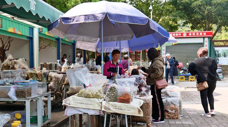 畲族风情街舞蹈队成员在街上销售农特产。