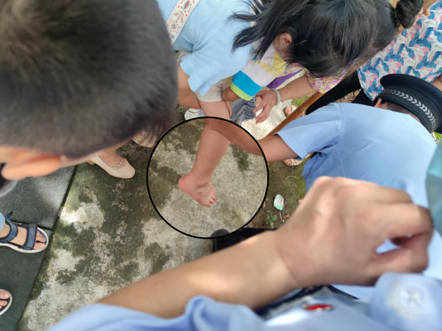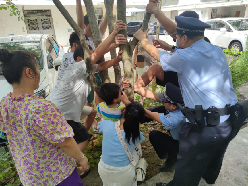 接到报警后,正在社会面开展日常巡逻工作的警员迅速往现场。警员到达现场时,该名男童的一条小腿正紧紧卡在树杈的缝隙间,周围的热心群众已尝试过各种办法,但都失败了。