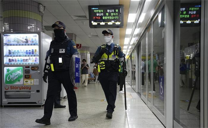 当地时间2023年8月4日韩国城南市,警察在周四的袭击后于Ori地铁站巡逻。
