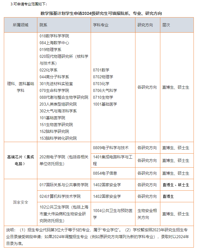 复旦大学数学科学学院2020级强基计划学生申请2024级研究生可填报的院系、专业、研究方向如下: