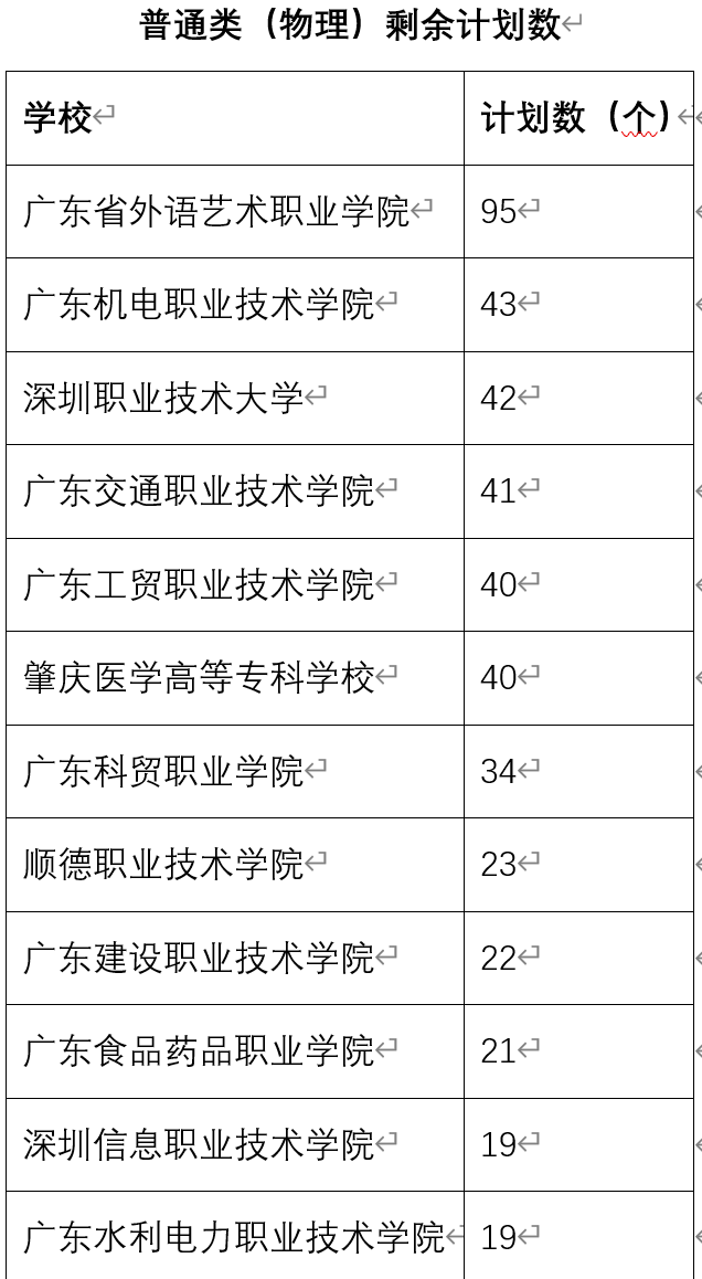 记者梳理发现,与专科批次普通类投档时省内院校缺额计划较少相比,此次征集志愿还有不少省内优质院校的名额,其中包括深受考生青睐的本科院校的专科专业组、国家“双高计划”建设院校、省域高水平高职院校以及少数本专科三二分段协同培养计划。深圳职业技术大学、顺德职业技术学院、广东交通职业技术学院、广东机电职业技术学院、广东工贸职业技术学院、广州番禺职业技术学院、广东农工商职业技术学院、广东建设职业技术学院、广东职业技术学院、广州卫生职业技术学院、肇庆医学高等专科学校、广东科贸职业学院等优质院校剩余计划均超过20个。
