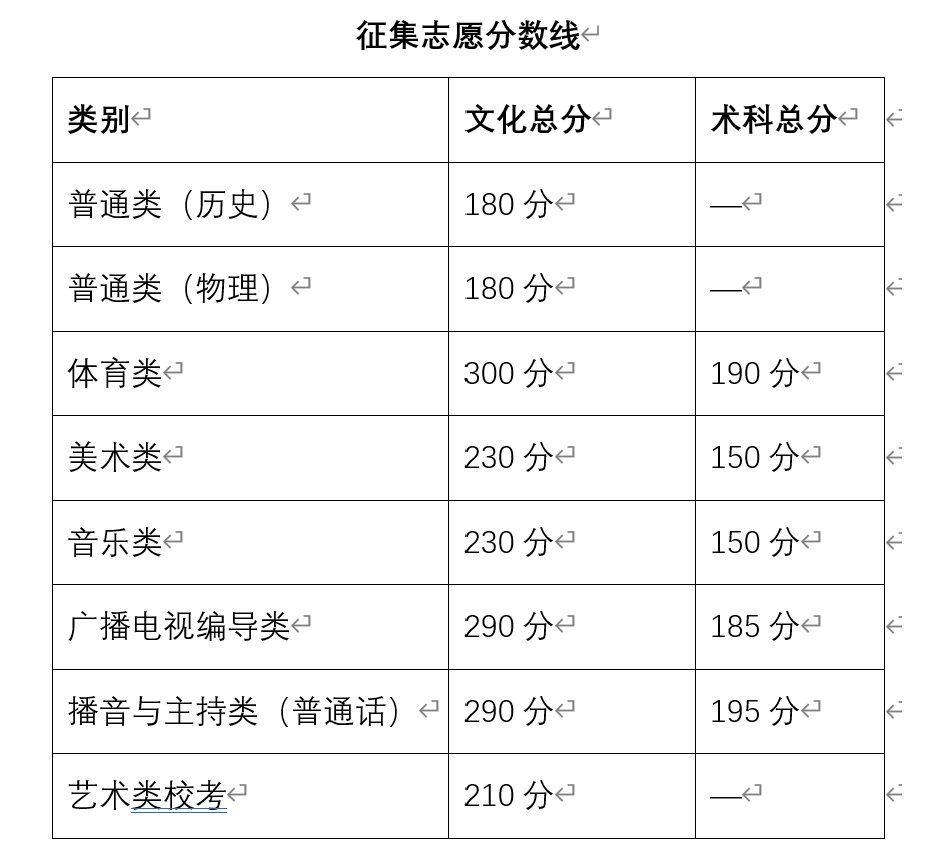 此次征集志愿的部分类别分数线比今年的专科线有所下降。其中体育术科降低5分,美术术科降低10分,音乐类术科降低10分,广播电视编导类文化总分降低20分,术科降低5分,播音与主持类(普通话)文化总分降低20分,术科降低15分。