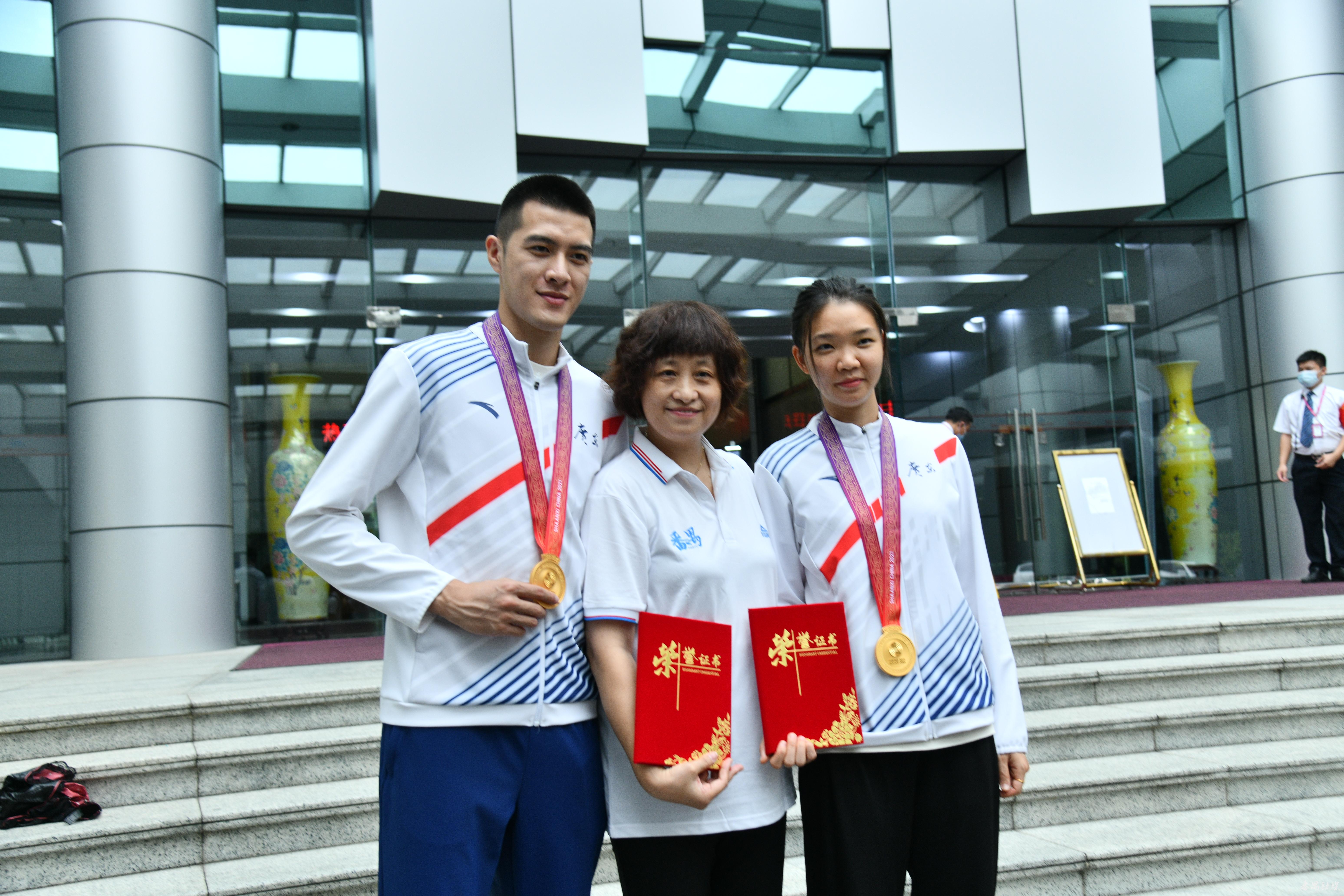 严国庆(中间者)和载誉归来的爱徒许英明、郭怡琪合影