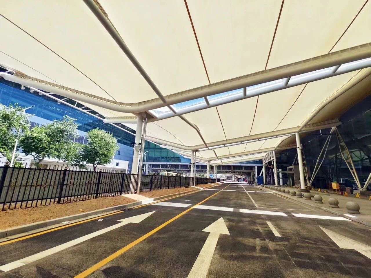 新白广城际机场T1站还建工程面积大、点位多、方案复杂,近7万平方米的建设面积分布在航站区周边约六个区域,牵涉白云机场六个单位的多项核心业务,涉及道路、交通、给排水、强弱电、钢膜结构等近十个专业方案,各项方案研究制订过程需结合机场意见不断调整、优化,以满足机场运营服务要求。还建工程工期紧、任务重,需在近3个月时间完成约500吨钢结构和1.1万平方米张拉膜安装,并完成约3.1万平方米停车场和2.4万平方米道路及其给排水、强弱电、旅客服务配套设施的施工任务,施工期间又恰逢“龙舟水”连续降雨、台风等恶劣天气,给施工带来重重挑战。