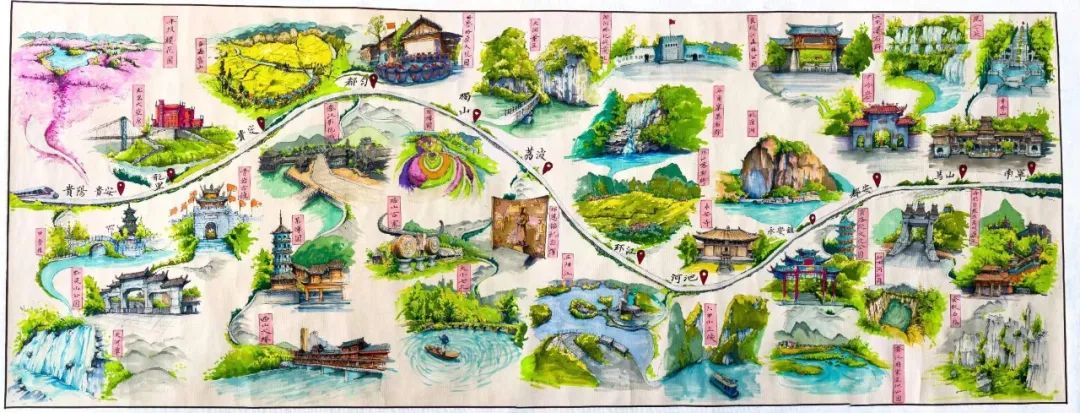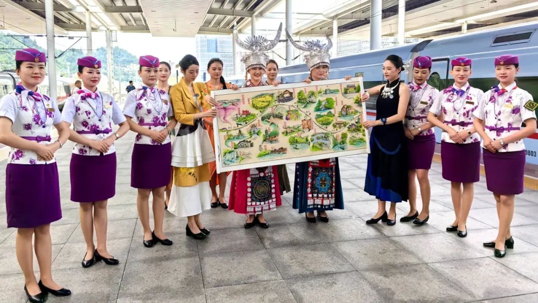 随着一幅2米多长的手绘贵南高铁美景画卷徐徐展开——深河桥抗战纪念遗址、邓恩铭烈士纪念馆等跃然纸上,令人向往一趟贵南红色之旅;都匀秦汉影视城、独山天洞景区、荔波小七孔等多个景区绿意盎然、充满生机。