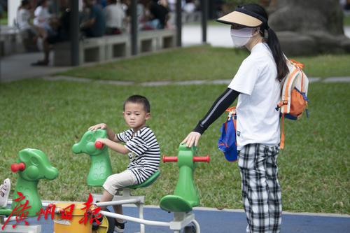 虽无雨,但天气阴沉,不少市民趁着阴天带着孩子到公园游玩。