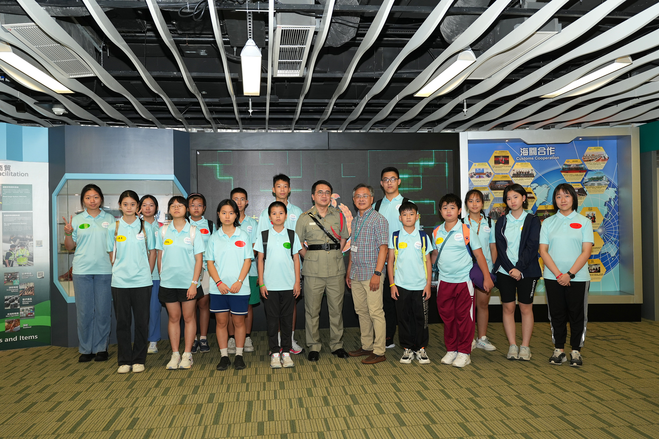 香港科大之行結束後,小記者們馬上趕往下一站——香港海關總部。香港海關為了孩子們,不僅準備了豐富的參觀行程,還安排了高級監督李志銘、退休監督陳漢民、督察王致遠、督察林少翠、督察陳卓希與督察區凱婷等六位專業人士一起參加本站活動。