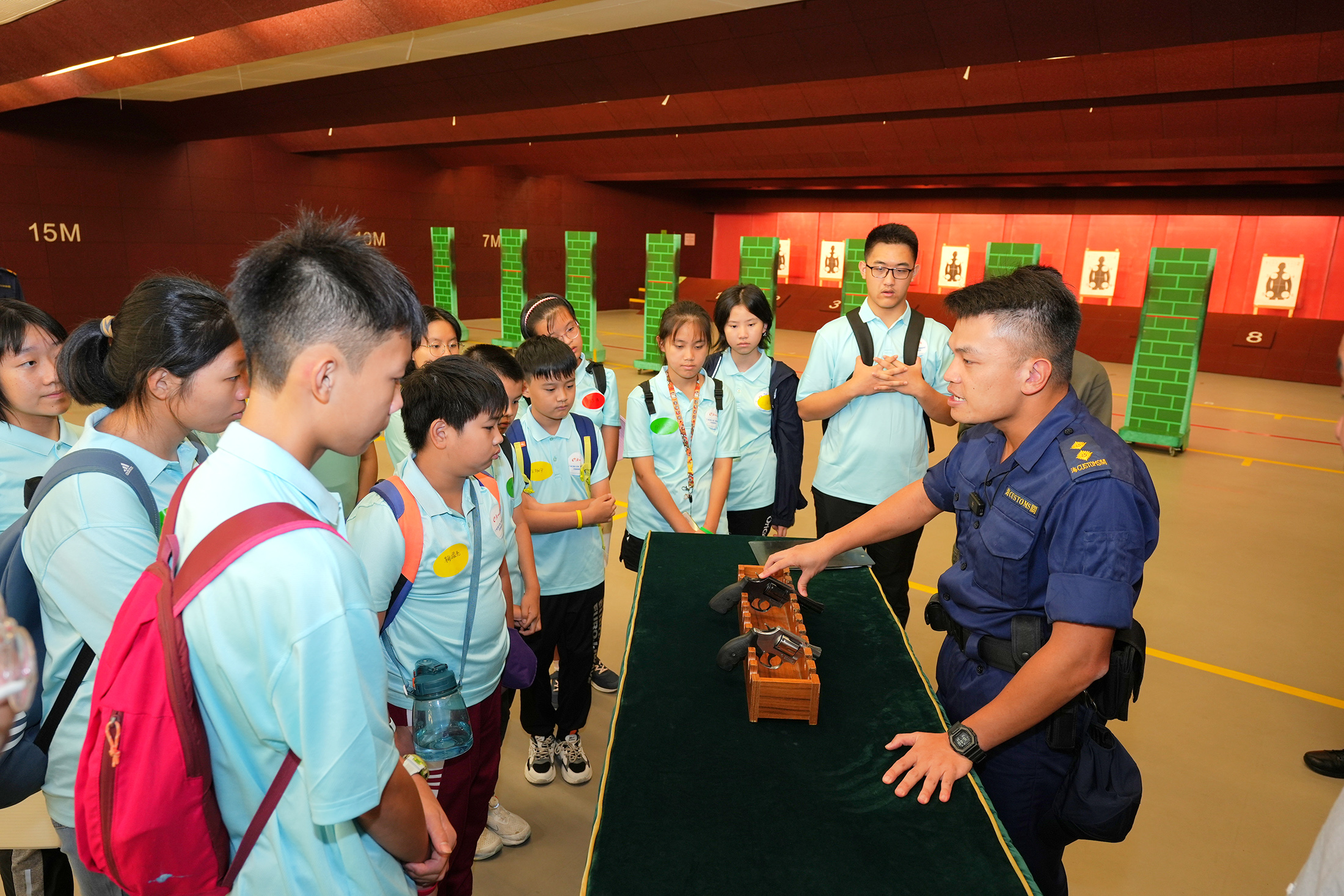 在香港海關室內綜合訓練靶場,督察陳卓希向小記者們介紹海關執法人員使用的槍械。