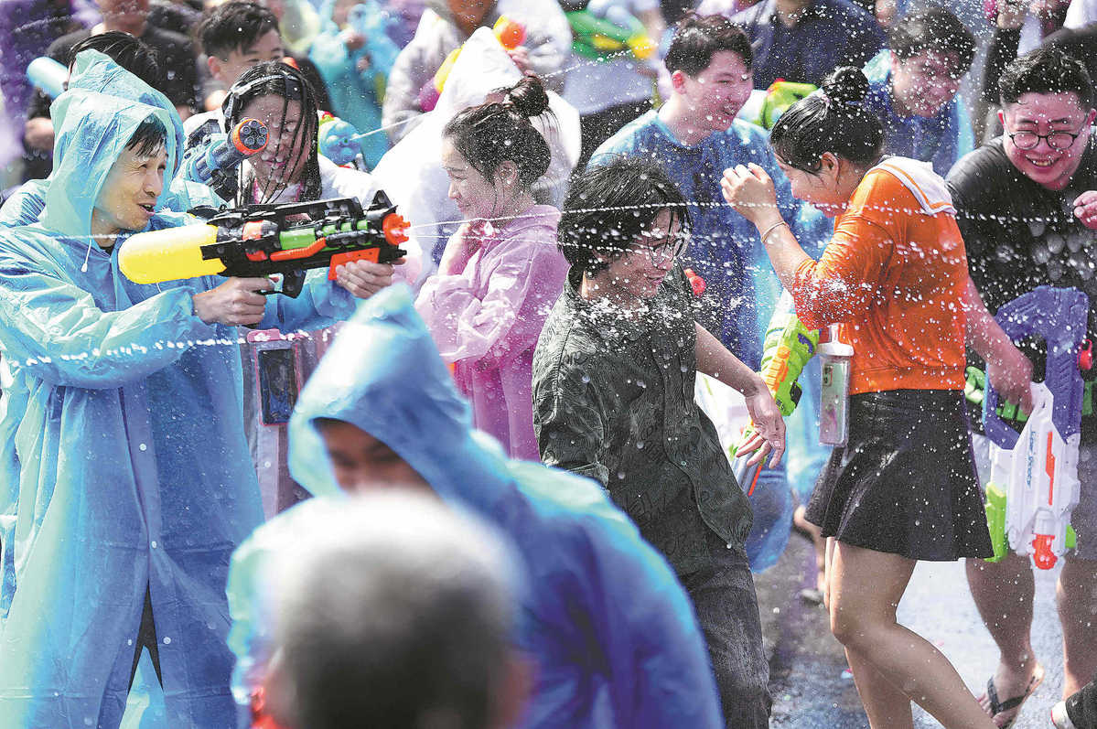 People spray water at each other during Maishen Festival in Dongguan, Guangdong province, on Feb 21. CHEN FAN/FOR CHINA DAILY