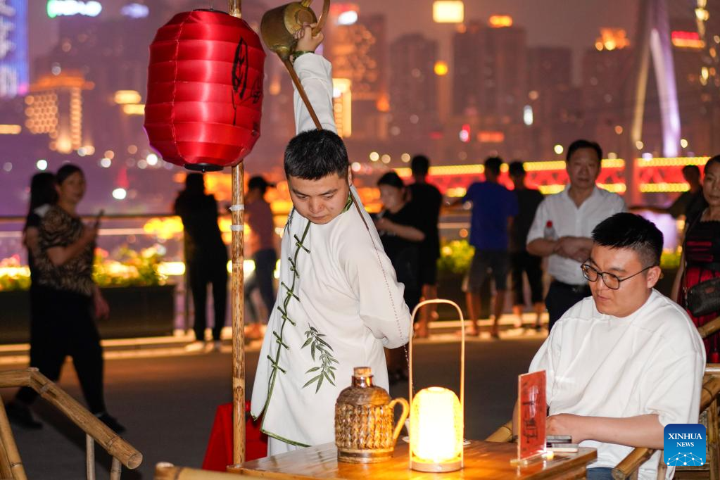 A tourist watches a tea art show in Chongqing's Opening Port Heritage Park in Southwest China's Chongqing, June 9, 2023. [Photo/Xinhua]
